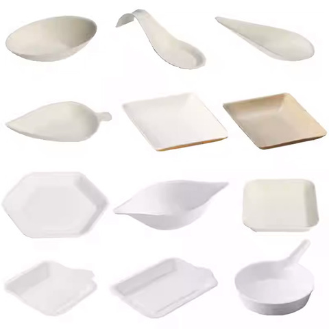 Platos de postre desechables de alta resistencia personalizados, juego de vajilla seguro de bagazo de diseño moderno ecológico para fiestas de restaurantes